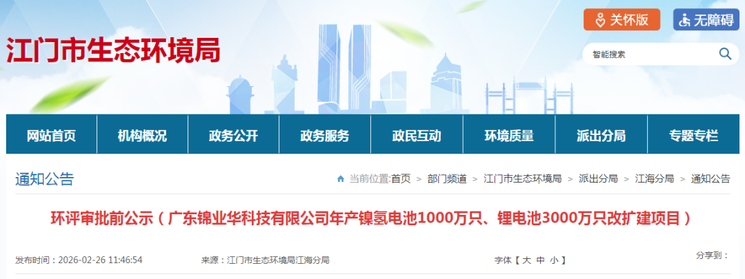 公示信息顯示,改擴建項目位于江門市高新區邦民路12號,占地面積2721.02平方米,建筑面積14557.6平方米,年產鎳氫電池1000萬只、鋰電池3000萬只改擴建項目。