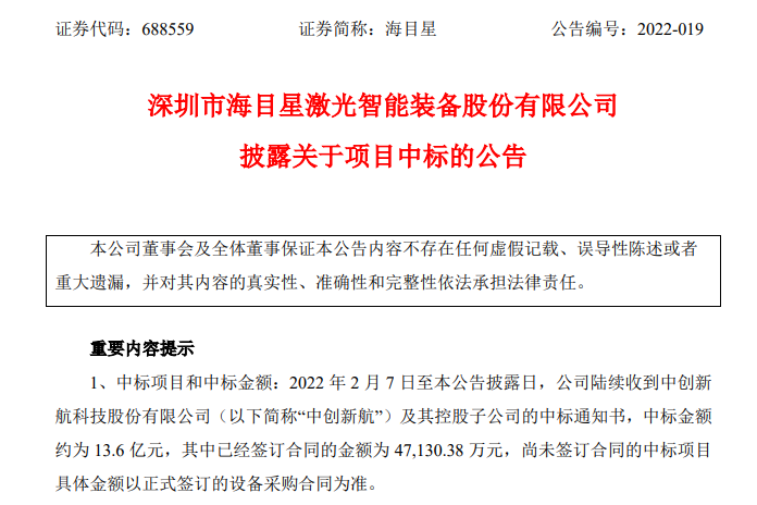 4月24日晚間,海目星(688559)發(fā)布公告,2月7日至今,公司陸續(xù)收到中創(chuàng)新航及其控股子公司的中標(biāo)通知書,中標(biāo)金額約為13.6億元。