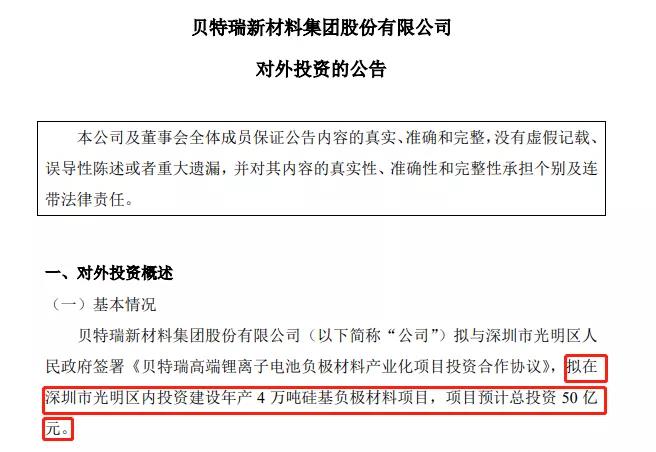 最新公告顯示,中國寶安子公司貝特瑞擬與深圳市光明區政府簽署投資合作協議,擬在深圳市光明區內投資建設年產4萬噸硅基負極材料項目,項目預計總投資50億元。