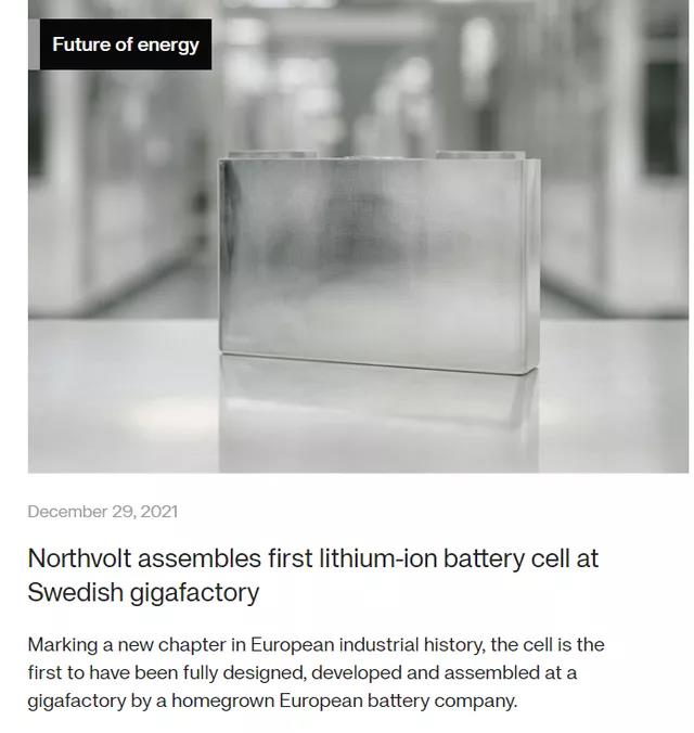 12月29日,Northvolt 在官網(wǎng)發(fā)布公告稱,公司已在瑞典北部的Ett超級(jí)工廠成功生產(chǎn)出首塊鋰離子電池,并計(jì)劃于2022年開始商業(yè)交付。