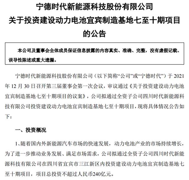 公告顯示,寧德時(shí)代董事會(huì)已通過相關(guān)投資項(xiàng)目,擬投資不超過240億元建設(shè)動(dòng)力電池宜賓制造基地七至十期項(xiàng)目。
