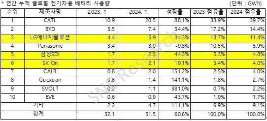 根據(jù)韓國市場調(diào)查機構(gòu) SNE Research 發(fā)布的最新報告,2024 年 1 月全球電動汽車電池總裝機量為 51.5 GWh,相比較去年 1 月(32.1 GWh)增長了 60.6%。