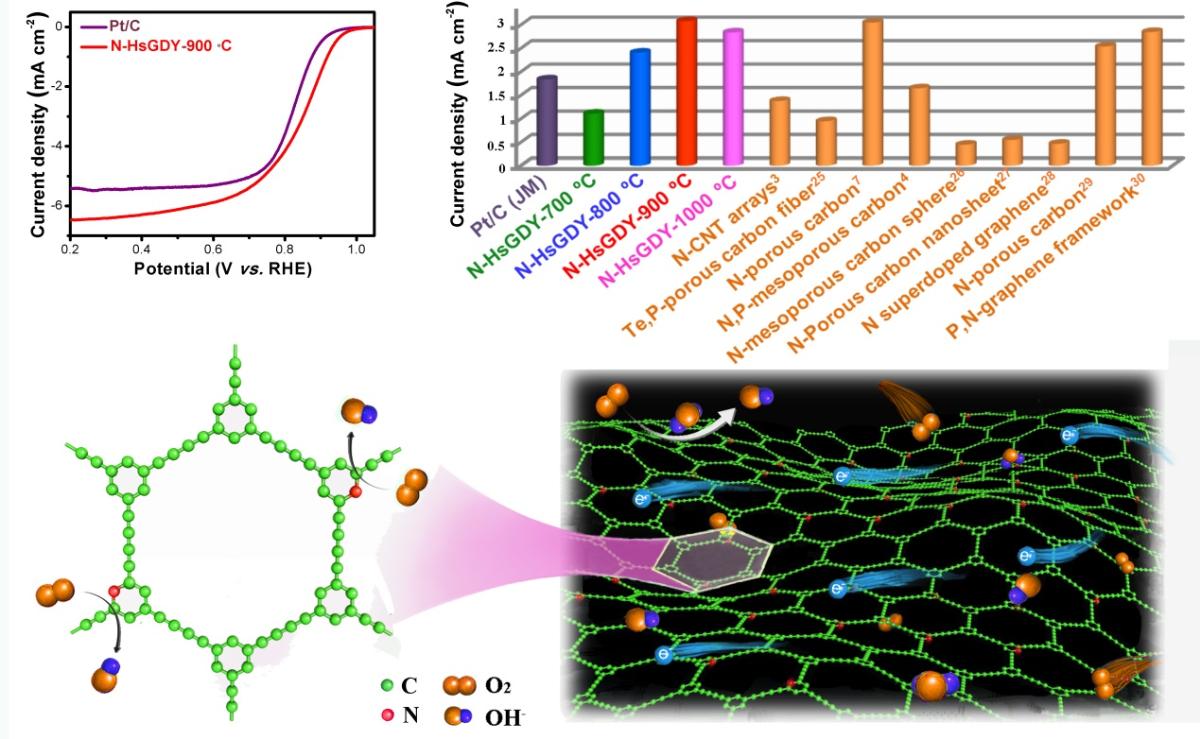 得益于HsGDY的獨特結構,在對其進行后處理過程中,碳基材料與能源應用研究組準確控制了氮的摻入類型,選擇性摻入對燃料電池陰極電催化最有效的吡啶氮原子,從而實…