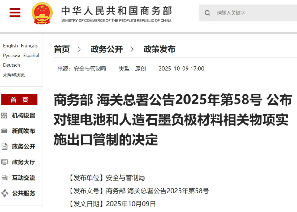 10月9日,商務部、海關總署公告2025年第58號,公布對鋰電池和人造石墨負極材料相關物項實施出口管制的決定。