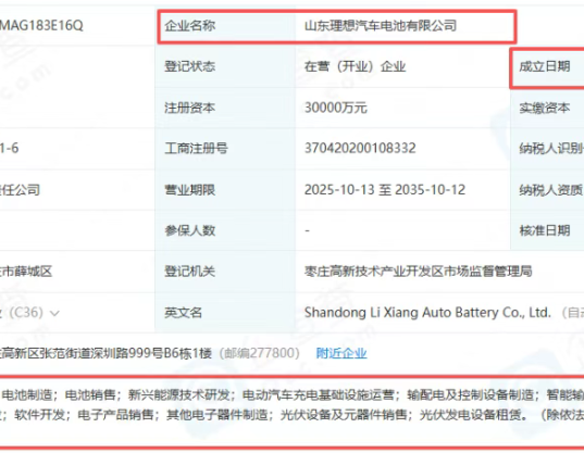 10月13日,山東理想汽車電池有限公司在山東省棗莊高新區完成注冊登記,標志著理想汽車與欣旺達以50:50出資比例共建的合資公司正式落地。