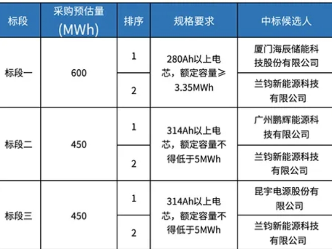 本次預估采購量1.5GWh,海辰儲能、鵬輝能源、昆宇電源、蘭鈞新能源這四家企業入圍,投標報價在0.41-0.456元/Wh區間內。
