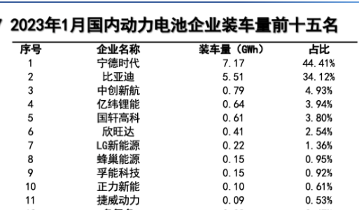 2023年1月我國動力電池裝車量16.1GWh,同比下降0.3%,環比下降55.4%。從裝車量排名看,寧德時代、比亞迪、中創新航依舊位列裝車量排名前三,其他名次企業再度生變…