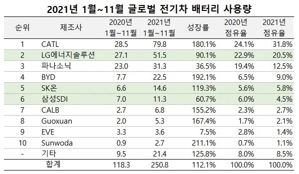1-11月全球動(dòng)力電池裝機(jī)量TOP10出爐!
