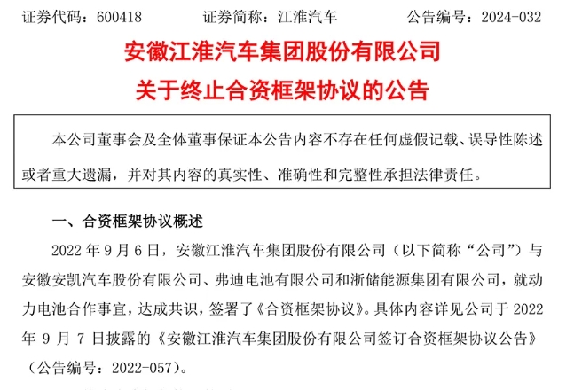 江淮汽車表示,本協議僅為各方意向合資合作的框架性約定,各方并未簽署正式的《合資經營合同》,不構成各方之間就本次合資合作的法律約束力。公司終止本次合資框架…