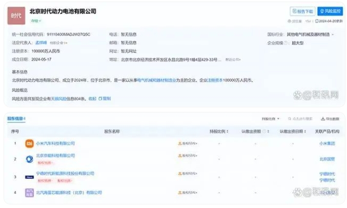 小米寧德時(shí)代等成立動(dòng)力電池公司,注冊(cè)資本10億