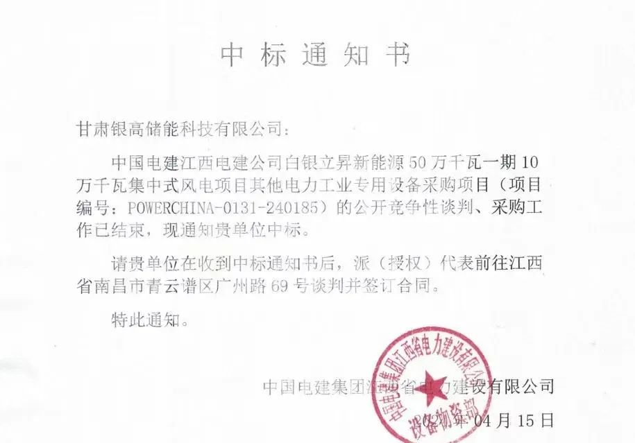 4月15日,銀高儲能已成功中標中國電建集團江西省電力建設有限公司白銀立昇新能源50萬千瓦首期10萬千瓦集中式風電項目其他電力工業專用設備采購項目。