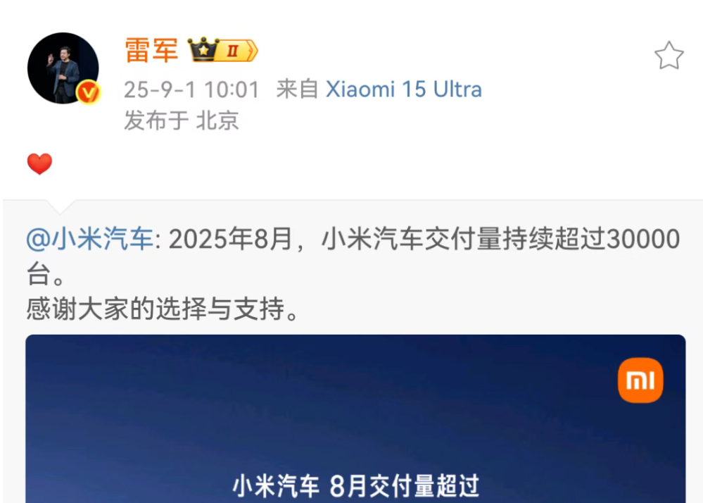 9月1日,小米汽車發(fā)布微博稱,8月交付量超3萬輛。