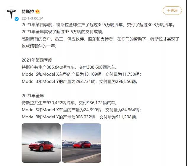 特斯拉全年交付超93.6萬輛汽車,Q4交付超30.8萬輛……