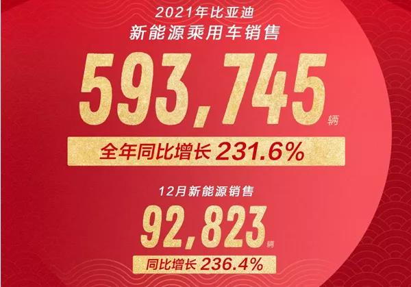 2021年,比亞迪乘用車銷售73萬輛,同比增長75.4%;新能源乘用車全年銷量593745輛,同比增長231.6%