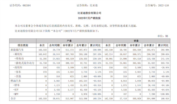 根據比亞迪官方數據,今年7月,比亞迪新能源車銷量達162530輛,同比增長183.1%,其中乘用車銷售162214輛,同比增長184.7%。