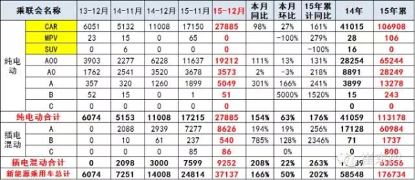 在廠家沖刺十二五的目標(biāo)推動和政策促進(jìn)下,12月乘用車車市呈現(xiàn)生產(chǎn)批發(fā)均超創(chuàng)新高的超強(qiáng)增長特征,為經(jīng)濟(jì)穩(wěn)增長和產(chǎn)業(yè)轉(zhuǎn)型升級做出巨大貢獻(xiàn)。而12月新能源乘用車也是爆發(fā)增長,而初步統(tǒng)計(jì)看15年新能源狹義乘用車銷量17.7萬臺,同比增長2倍,為十二五的中國新能源車發(fā)展的良好業(yè)績作出貢獻(xiàn)。