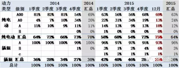 15年的純電動車中的A00級車占比達(dá)63%,且A0級成為純電動乘用車的絕對主力,這兩類組合的經(jīng)濟(jì)型電動車成為主力。但12月的A級電動車爆發(fā)增長到18%,這是暫時的缺貨和搶年度數(shù)量的特殊狀態(tài),同時也是A0級電動車的缺貨的影響。
