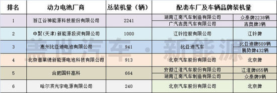 排在第三位的是惠州比亞迪電池有限公司,其裝機量為941輛,主要配套車型是比亞迪牌(裝機量為509輛)和騰勢牌(裝機量432輛)。