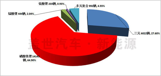 當月所生產的純電動客車,采用磷酸鐵鋰動力電池的數量是14143輛,占據64.9%的份額,位居第一;三元材料動力電池的裝機量為6022輛,占總份額的27.6%;多元復合材料動力電池、錳酸鋰動力電池、鈦酸鋰動力電池所占當月份額分別為4.55%、2.04%、0.93%。