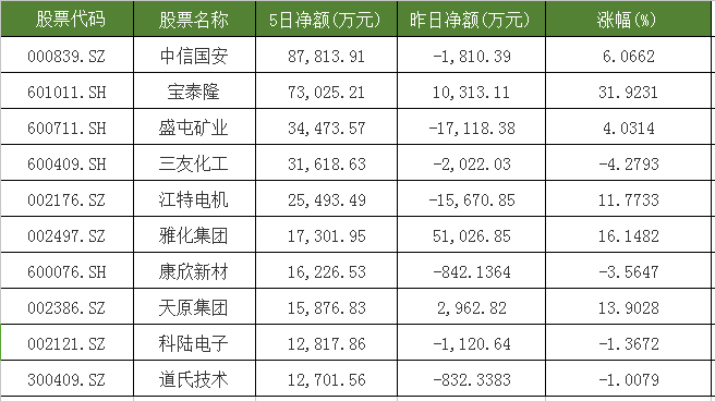 據數據顯示,本周鋰電池板塊資金流入前五個股分別為中信國安、寶泰隆、盛屯礦業、三友化工以及江特電機,具體數據顯示,中信國安最獲資金追捧,5日流入金額高達8.78億,寶泰隆緊隨其后,本周流入資金為7.3億,其余三只個股流入資金分別為3.44億、3.16億、2.54億。