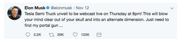 11月12日,這位億萬富豪及科技產(chǎn)業(yè)巨頭在Twitter上發(fā)文說道:“特斯拉Semi卡車發(fā)布儀式于周四晚間8時開始網(wǎng)上直播!這款車型將令你大開眼界,耳目一新,將你帶入新境界。我得找找自己的傳送槍(Portal Gun)。