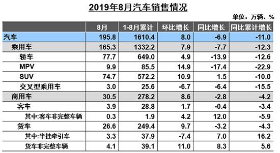 8月汽車產銷量分別完成199.1萬輛和195.8萬輛,同比下降0.5%和6.9%。陳士華表示,汽車市場受國五車型促銷透支的影響還未退卻,8月銷量不足200萬輛,同比降幅進一步擴大,屬于歷年來的低谷期。