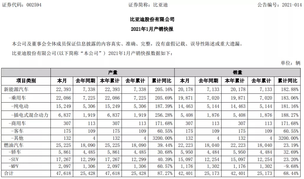 2月3日晚,比亞迪(002594)公告稱,公司1月份新能源汽車銷量20178輛,同比增長182.88%;產量22393輛,同比增長205.16%;燃油汽車銷量22223輛,同比增長23.19%;產量25225輛,同比增長39.44%。公司2021年1月新能源汽車動力電池及儲能電池裝機總量約為1.754GWh。