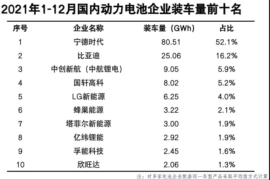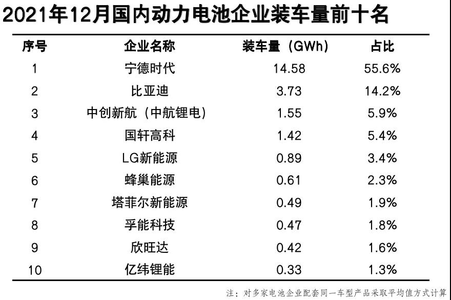 2021年12月國(guó)內(nèi)動(dòng)力電池企業(yè)裝車量TOP10