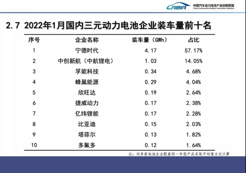 2022年1月,我國三元動力電池企業裝車量前十名分別為:寧德時代、中創新航、孚能科技、蜂巢能源、欣旺達、捷威動力、億緯鋰能、比亞迪、塔菲爾、多氟多。其中,寧德時代、中創新航、孚能科技市場份額排名前三,分別為57.17%、14.05%、4.68%。