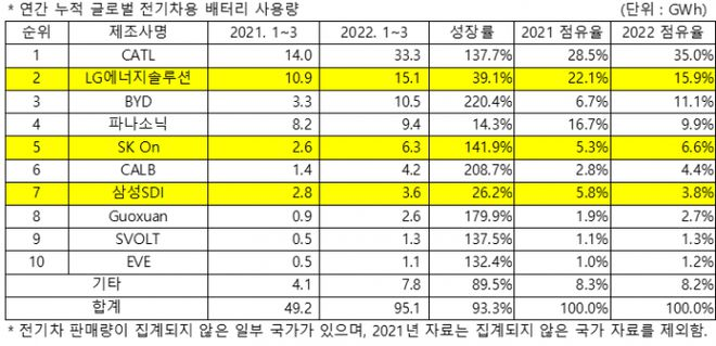 LG Energy Solution、SK On 和 Samsung SDI 的市場份額在 1 月至 3 月期間為 26.3%,相比之下去年則為 33.2%。