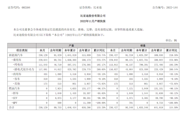 12月2日,比亞迪公布11月銷量數(shù)據(jù),11月新能源汽車銷量23.04萬輛,上年同期為9.12萬輛,同比增長152%。今年前11個月,新能源汽車銷量為162.8萬輛,比上年同期增長219.38%。