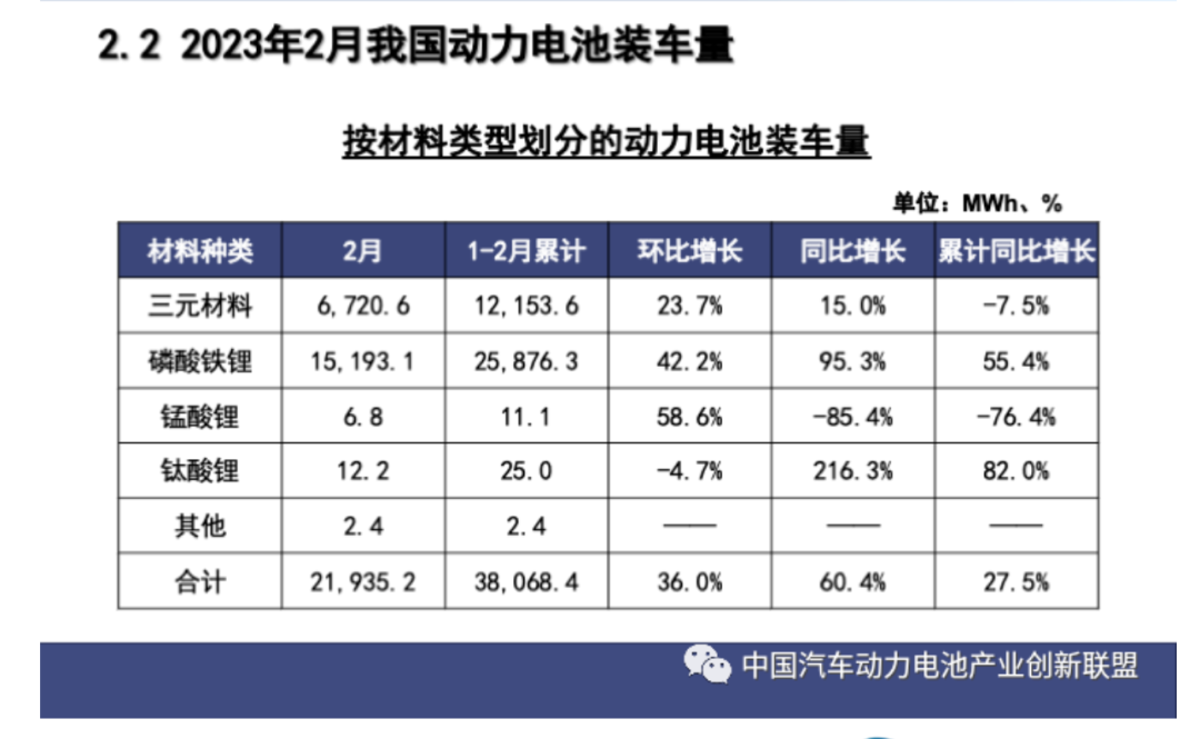 創新聯盟數據顯示,今年2月,國內動力電池裝車量21.9 GWh,同比增長約六成。其中,磷酸鐵鋰電池裝車量為15.2 GWh,同比上漲95%,占總裝車量的近七成,創下歷史新高。三元電池裝車量為6.7 GWh,占總裝車量剩余三成。