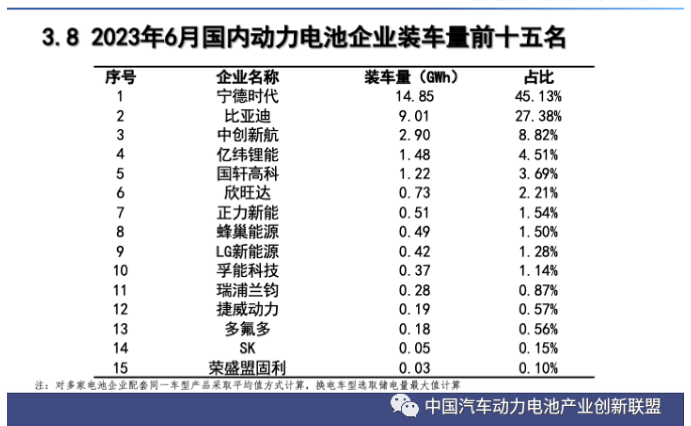 6月份國內(nèi)動力電池企業(yè)裝車量TOP15分別是:寧德時代、比亞迪、中創(chuàng)新航、億緯鋰能、國軒高科、欣旺達(dá)、正力新能、蜂巢能源、LG新能源、孚能科技、瑞浦蘭鈞、捷威動力、多氟多、SK On、榮盛盟固利。