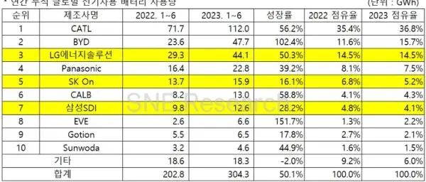 相較而言,2023年1—6月韓國三家公司LG新能源、三星SDI和SK on 市場占有率23.9%,比去年同期下降了2.2個百分點,但三家公司的電池裝車量均呈現增長趨勢。LG能源44.1GWH與去年同期相比增長50.3%,排在第三位,SK on裝車15.9GWH,同比增長16.1%,三星SDI裝車12.6GWH,同比增長28.2%,分別排在第五位和第七位。