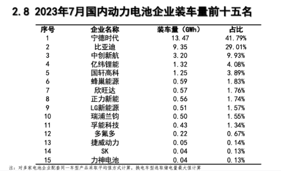 7月份國內(nèi)動力電池企業(yè)裝車量TOP15分別是:寧德時代、比亞迪、中創(chuàng)新航、億緯鋰能、國軒高科、蜂巢能源、欣旺達(dá)、正力新能、LG新能源、瑞浦蘭鈞、孚能科技、多氟多、捷威動力、SK On、力神電池。