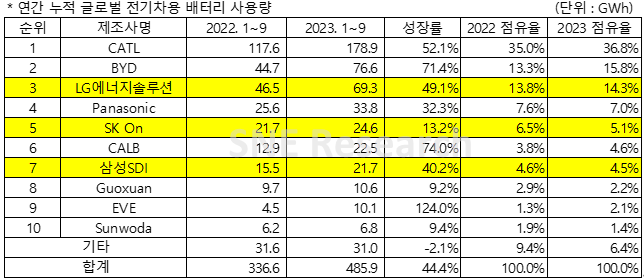 除了6家中企,韓國(guó)三家電池企業(yè)以及日本松下地位也依然穩(wěn)固。韓國(guó)方面,1-9月LG新能源動(dòng)力電池裝車量同比增長(zhǎng)49.1%至69.3GWh,排名第三,SK On和三星SDI分別排名第五和第七,同比分別增長(zhǎng)13.2%至24.6GWh,增長(zhǎng)40.2%至21.7GWh。此外,日本松下以33.8GWh裝機(jī)量,同比增長(zhǎng)32.3%的成績(jī)位列全球動(dòng)力電池裝車量第四位。