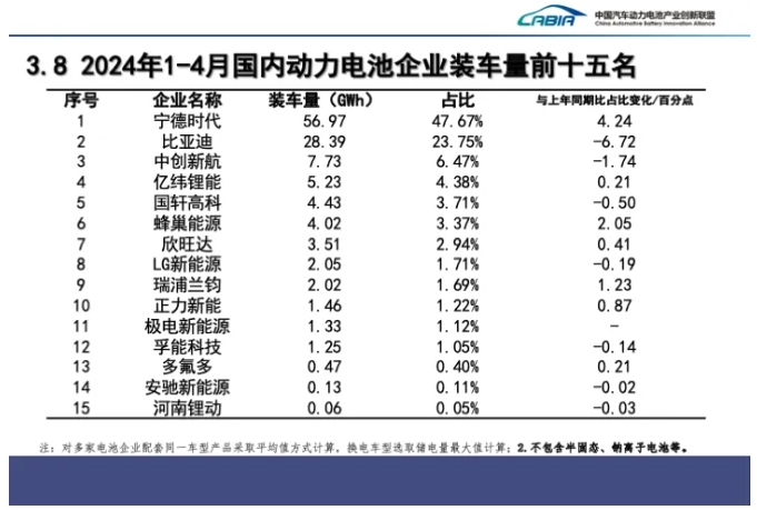 今年4月,寧德時代國內動力電池裝車量達15.65 GWh,市占率為44.65%,仍穩居榜首,但較前一月出現小幅下滑。排在第二位的比亞迪4月國內動力電池裝車量為9.95 GWh,市占率為28.37%,環比增長了1.58個百分點。