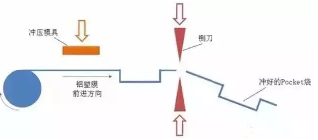 鋁塑膜沖好后,裁剪成型,一般稱為pocket袋,一般電芯較薄的時(shí)候選擇沖單坑,在電芯較厚的時(shí)候選擇沖雙坑,沖雙坑時(shí)會(huì)因?yàn)橐贿叺淖冃瘟看髸?huì)突破鋁塑膜的變形極限而導(dǎo)致破裂。