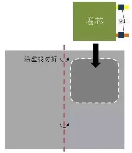 封裝工序包含頂封、側(cè)封兩個(gè)工序,首先要把卷繞好的卷芯放到?jīng)_好的坑里,然后將未沖一側(cè)沿沖坑一側(cè)對(duì)折。