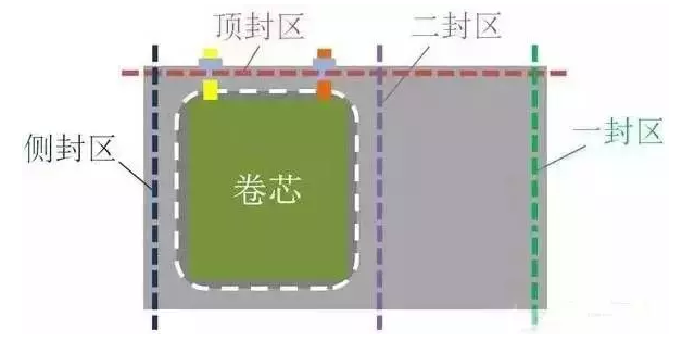 鋁塑膜裝入卷芯后,需要封裝的位置包括頂封區(qū)、側(cè)封區(qū)、一封區(qū)、二封區(qū)。