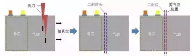 二封時(shí),首先由鍘刀將氣袋刺破,同時(shí)抽真空,這樣氣袋中的氣體與一部分電解液會(huì)被抽出。然后馬上進(jìn)行二封,保證電芯的氣密性。最后把氣袋剪去,一個(gè)軟包電芯就基本成型了。