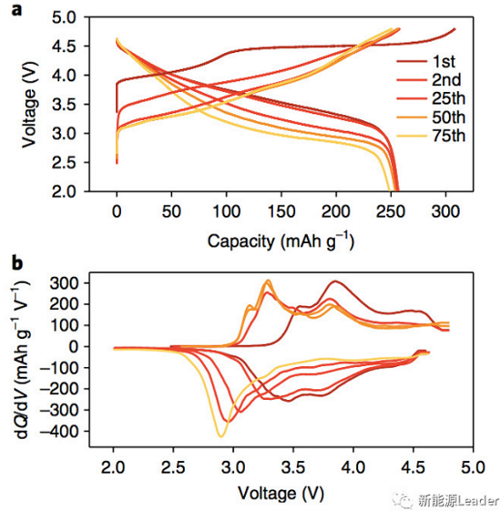 試驗中Enyuan Hu采用了典型的富鋰材料Li1.2Ni0.15Co0.1Mn0.55O2作為研究對象,該材料循環(huán)不同周期后充放電曲線和dQ/dV曲線如下圖所示,從圖中能夠明顯的看到隨著循環(huán)次數(shù)的增加,富鋰材料的電壓平臺呈現(xiàn)出了明顯的衰降趨勢。