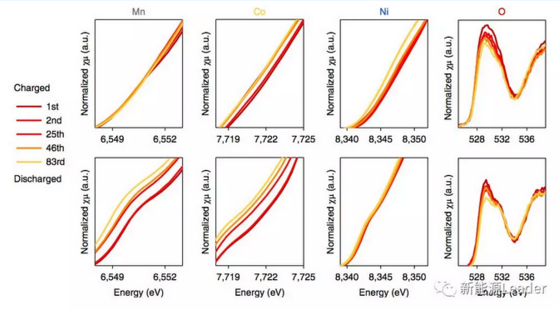 為了分析富鋰材料在循環(huán)中電壓衰降的機理,Enyuan Hu利用XAS工具分析了富鋰材料在第1、25、46、83次循環(huán)后,材料中的Ni、Co、Mn和O元素的價態(tài)的變化趨勢(如下圖所示),從圖中能夠看到Ni、Co、Mn三種過渡金屬元素的價態(tài)隨著循環(huán)次數(shù)的增加呈現(xiàn)了明顯的下降趨勢。O原子的變化主要發(fā)生在邊前區(qū)域,從下圖中能夠注意到隨著循環(huán)次數(shù)的增加,O原子的邊前峰強度呈現(xiàn)了明顯的減弱趨勢,這表明體相中的過渡金屬元素與O元素之間的鍵能降低。