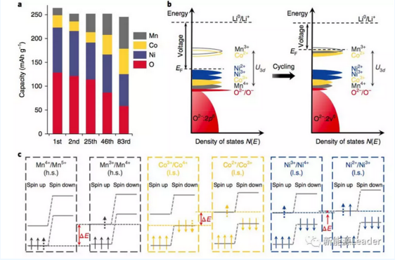 通過對上述的XAS數(shù)據(jù)半定量分析,EnyuanHu得到了在1、2、25、46和83次循環(huán)時富鋰材料中不同元素對材料整體容量的貢獻(如下圖a所示),從圖中可以看到在首次循環(huán)時O和Ni供應(yīng)了主要容量,分別達到128mAh/g和94mAh/g。但是隨著循環(huán)的進行,O和Ni元素提供的容量迅速減少,在83次循環(huán)時,O元素提供的容量僅為50mAh/g,Ni元素提供的容量也下降到了66mAh/g。但是Mn和Co元素貢獻的容量卻隨著循環(huán)次數(shù)的增加而增加,例如第一次放電時Mn、Co提供的容量分別14mAh/g和26mAh/g,但是隨著循環(huán)到83次時,兩者的容量分別增加到了66mAh/g和53mAh/g。
