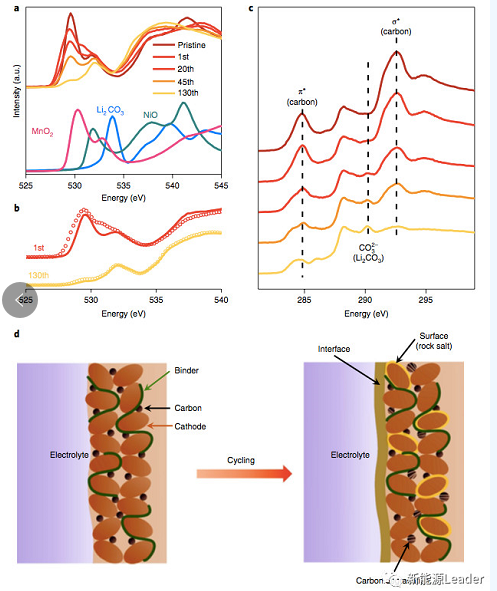 上面我們提到鋰離子電池在循環(huán)中富鋰材料的表面非常不穩(wěn)定,為了分析循環(huán)過程富鋰材料表面的結(jié)構(gòu)變化,Enyuan Hu又采用了軟X射線吸收進行了分析,從O K-edge圖中能夠看到,其邊前峰的強度隨著循環(huán)次數(shù)的增加持續(xù)的降低,導(dǎo)致這一現(xiàn)象的原因可能有兩個,一個是富鋰材料的表面層結(jié)構(gòu)從層狀結(jié)構(gòu)向巖鹽結(jié)構(gòu)衰變,第二個原因是富鋰材料電極界面因為電解液分解形成了一層包含Li2CO3, Li2O, LiOH, RCO2Li和R(OCO2Li)2的惰性層,C K-edge分析也發(fā)現(xiàn)了富鋰材料電極表面層的Li2CO3的含量在循環(huán)中顯著的增加了,這也支持了前面的分析。