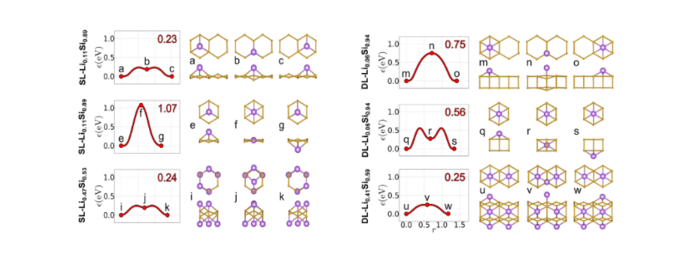 NEB可以用來計算過渡態(Transition state),也可以用來計算鋰離子在體系中的擴散。以層狀Si為例,[5]鋰離子在其表面的擴散可以有以下幾種方式,分別對應單層(SL)Si和雙層(DL)Si結構。擴散能磊越小,意味著鋰離子越容易擴散。可以看出不同的擴散方式以及不同濃度下鋰離子的擴散能磊各有不同。在實際計算中,通常先優化初始和末態的結構,然后利用vtst的腳本對中間結構進行差值。提醒讀者需要在插完值后對中間結構進行檢查。