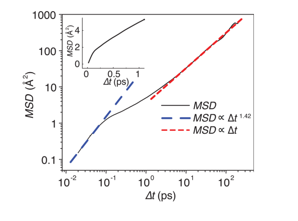 另外一種常用的計算方法是AIMD。由于其基于DFT,所以力場函數(Force filed)不用外加設定,這相比于經典的MD要更加方便。然而,由于其計算量要比經典MD大很多,所以一般的AIMD只適用于比較小的體系(幾百個原子)。基于AIMD,可以利用Einstein關系式計算鋰離子的擴散系數[6],即