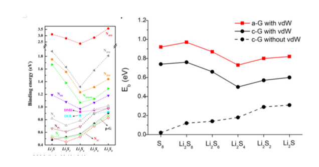N摻雜石墨烯可以有效地抑制多硫化物的脫附,從而控制穿梭效應。Cheng[7]等人研究了不同N摻雜結構石墨烯對多硫化物的吸附能,并得出結論認為石墨烯摻雜吡啶型聚類N可以有效地吸附多硫化物,如下圖左側所示。