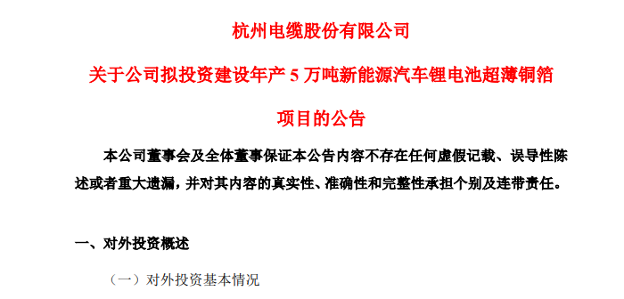 “本次對外投資符合公司戰略發展規劃,是公司立足長遠利益所作出的慎重決策,公司布局新能源汽車鋰電池超薄銅箔項目,進一步拓展了公司產業布局,推動了公司在新能源產業的發展,增強了公司發展潛力。”杭電股份表示,本次對外投資將增加公司資本開支和現金支出,從長遠來看對公司業務布局和經營業績具有積極影響。