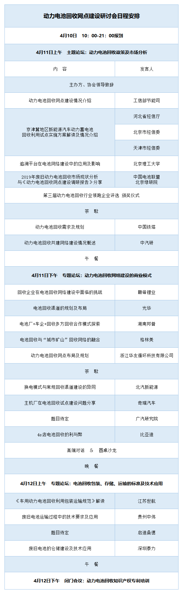 為了更好的幫助回收企業解決網點規劃布局、渠道建設和相應的技術人員等問題,中國電池聯盟、中國鐵塔、中國電子節能技術協會電池專委會、北京理工大學、清華大學聯合主辦的動力電池回收網點建設研討會將于4月10-12日在京召開。